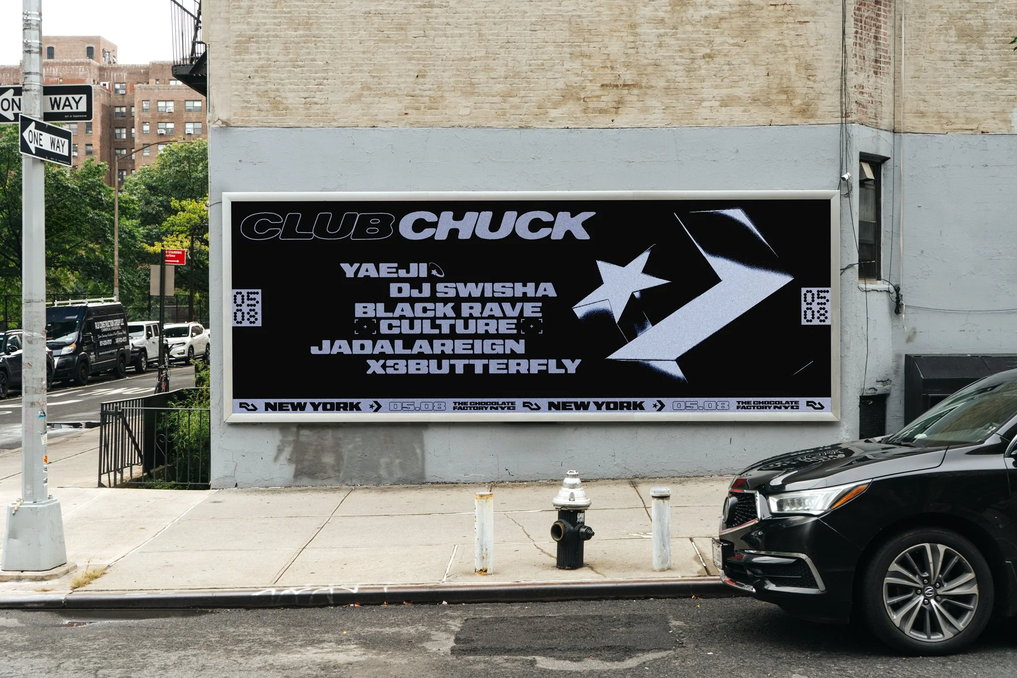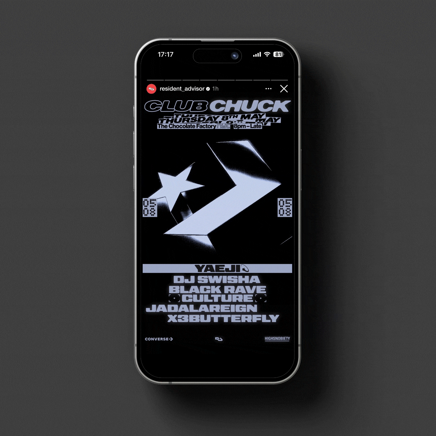 In May 2025, Resident Advisor, Converse and Highsnobiety hosted Club Chuck, an exclusive rave in East Williamsburg, Brooklyn, celebrating the cultural legacy of the Chuck Taylor sneaker. Working with the Resident Advisor team, a dynamic visual language was developed to unify promotional materials and onsite assets, drawing from the energy of rave culture while speaking to a contemporary audience. This flexible identity helped shape the atmosphere of the event, positioning the Chuck Taylor as both iconic and current. Club Chuck received over 12,000 sign-ups within two weeks of launch.